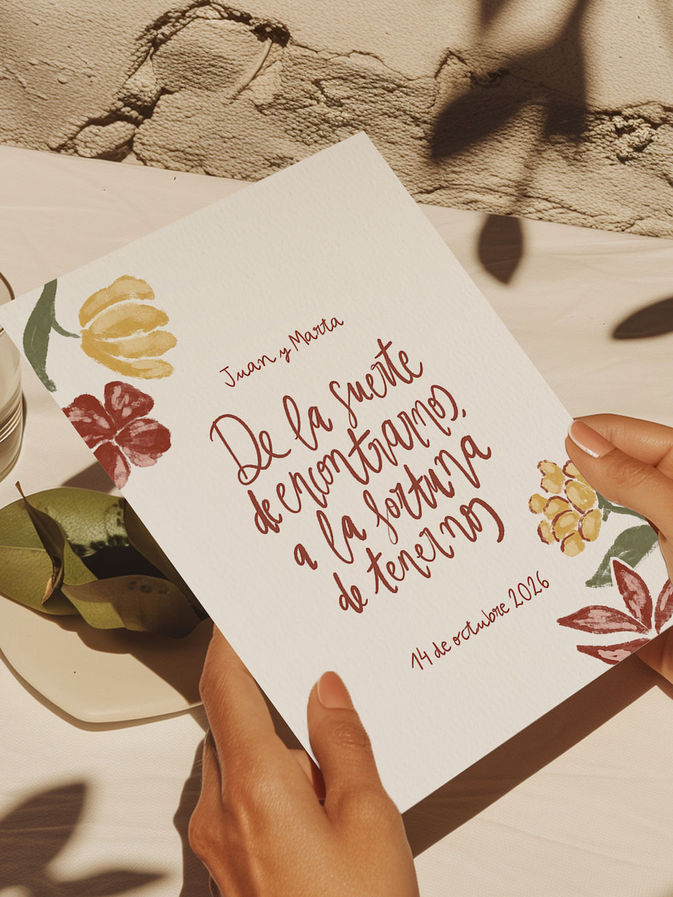 Lámina con una frase personal, elegida por los novios, que pueden llevarse los invitados como recuerdo de su día para enmarcar . Se coloca sobre la mesa o sobre los platos de los invitados.