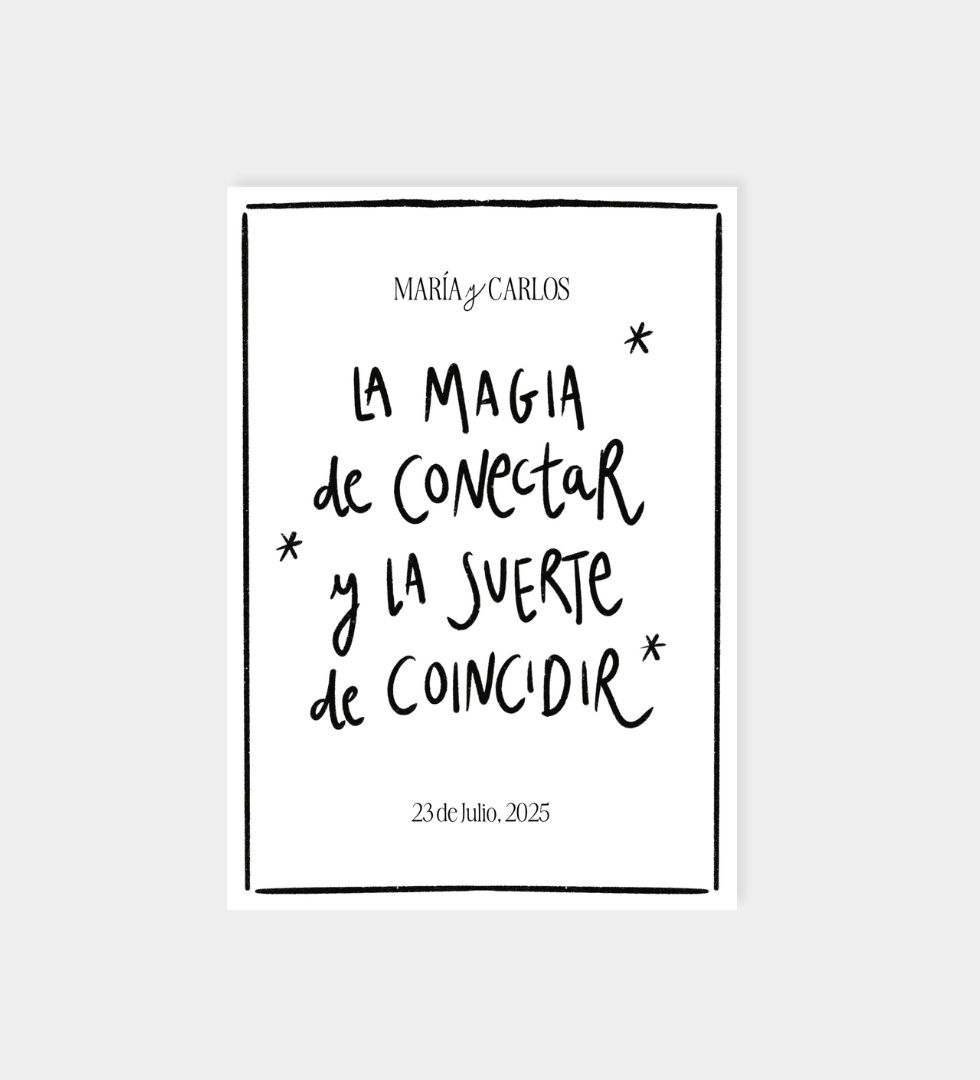 Lámina con una frase personal, elegida por los novios, que pueden llevarse los invitados como recuerdo de su día para enmarcar . Se coloca sobre la mesa o sobre los platos de los invitados.