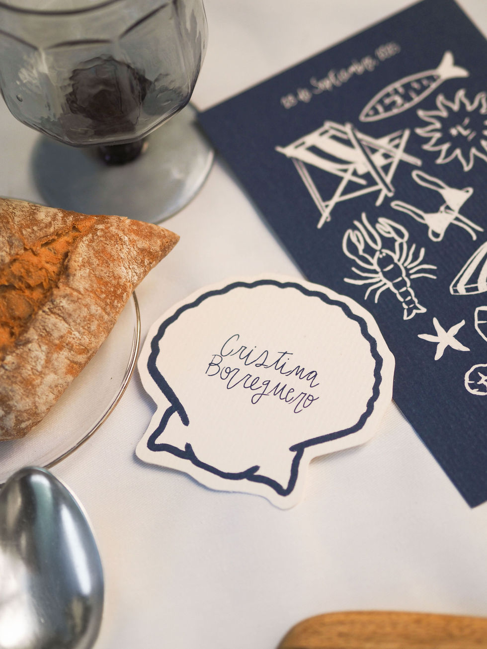 Los marcasitios se imprimen a una cara en papel verjurado de 300 gr recortado en forma de concha.
