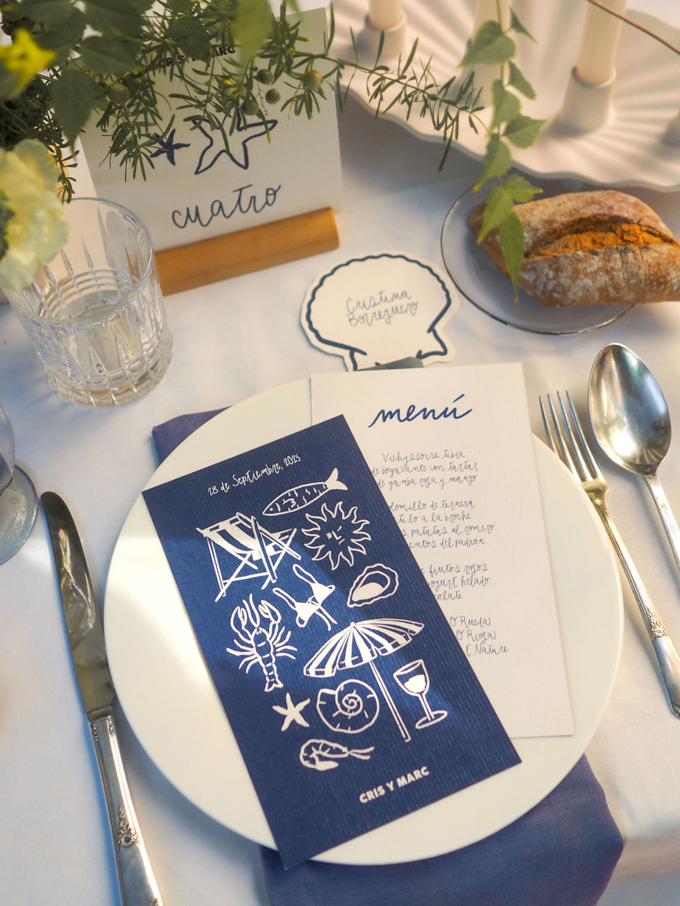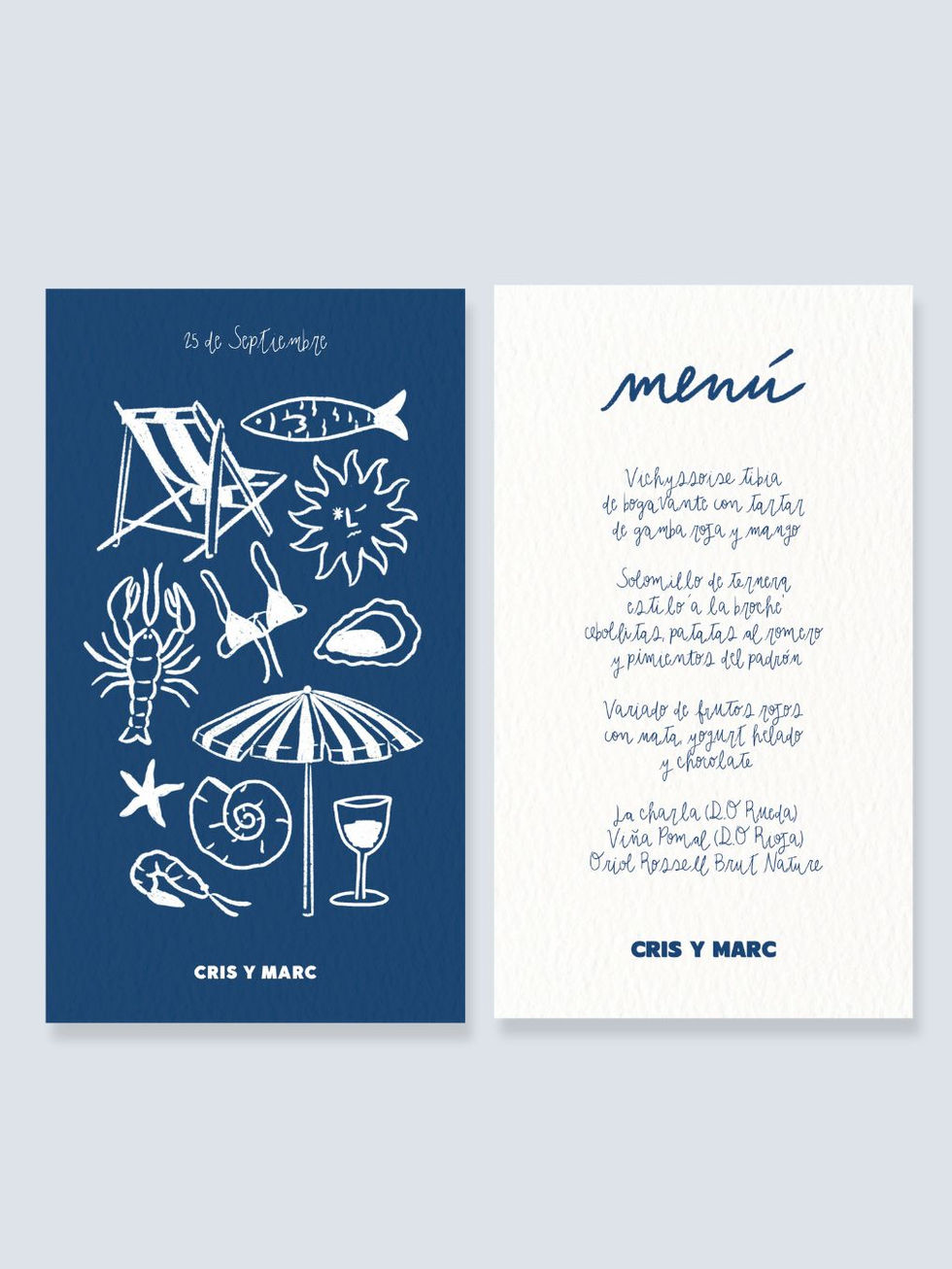 Menú a dos caras. En la parte superior encontramos la fecha de la boda y nombre de los novios acompañado de los elementos de diseño característicos de la colección. En la parte posterior encontramos el menú que se servirá durante el evento.